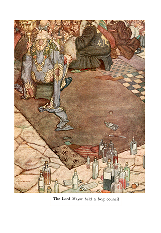 This classic story is accompanied by 16 incredible colour illustrations many black and white woodcuts by W. Heath Robinson. An English cartoonist and illustrator, best known for drawings of ridiculously complicated machines – for achieving deceptively simple objectives. Such was (and is) his fame, that the term ‘Heath Robinson’ entered the English language during the First World War, as a description of any unnecessarily complex and implausible contrivance.
