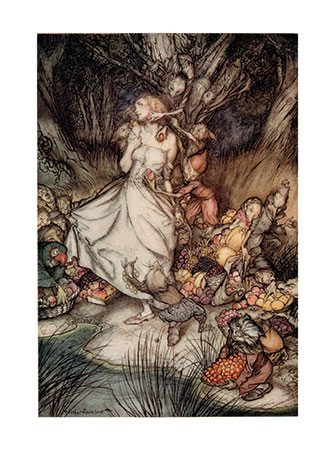 The edition of Goblin Market is also accompanied by a series of illustrations by Arthur Rackham (1867-1939). One of the most celebrated painters of the British Golden Age of Illustration (which encompassed the years from 1850 until the start of the First World War), Rackham’s artistry is quite simply, unparalleled. Throughout his career, he developed a unique style, combining haunting humour with dream-like romance. Presented alongside the text, his illustrations further refine and elucidate Rossetti’s masterful poetry.