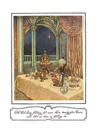 This edition of Sleeping Beauty and Other Fairy Tales further contains a set of dazzling coloured illustrations by a true master of the ‘Golden Age’; Edmund Dulac (1882 – 1953). A French artist himself, Dulac had a particular affinity with these Old French tales as well as a rigorously painterly background. The end result was beautifully coloured images which further refined the wonderful stories of Perrault, D’Aulnoy – retold by Arthur Quiller-Couch. Appearing alongside the text, his illustrations enhance and elucidate the enchanting narratives.