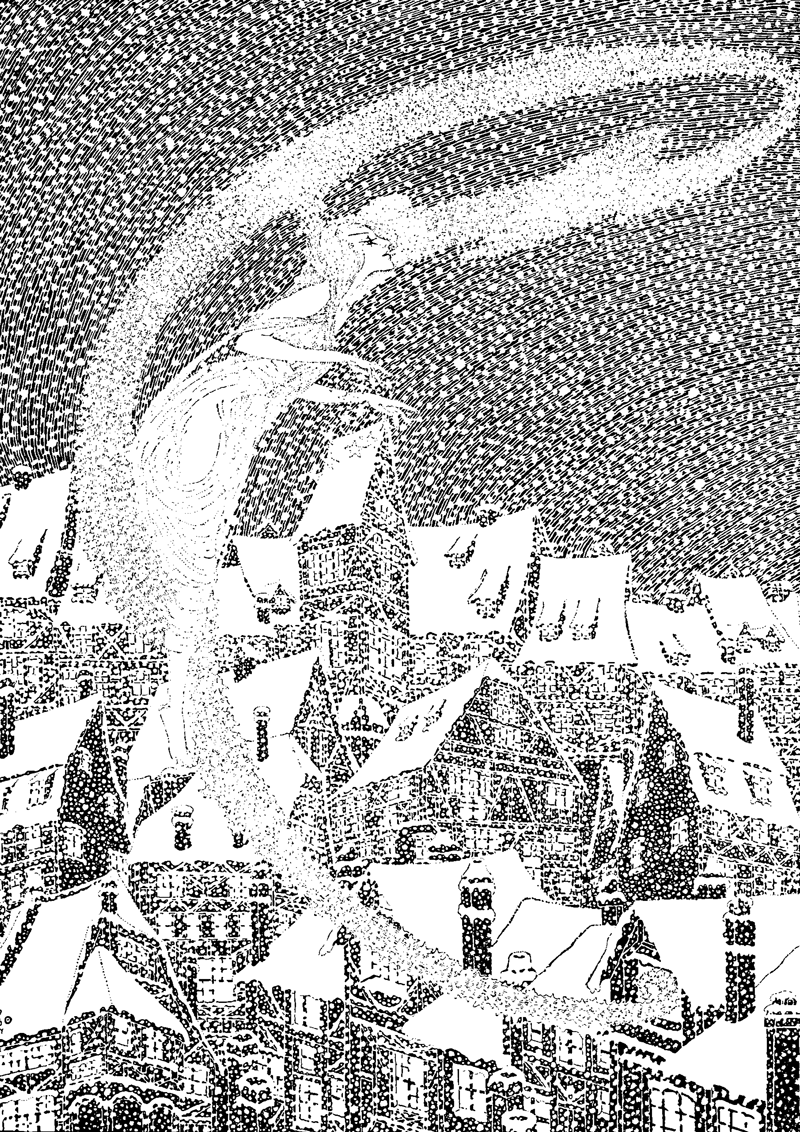 “Yes, they have one,” said grandmother. “She always flies where they swarm thickest. She is the largest of them all, and never settles on the earth, but flies up again into the black sky. Many a winter’s night does she fly through the streets of the town, and looks in at the windows, and then they freeze fantastically and look like flowers.”