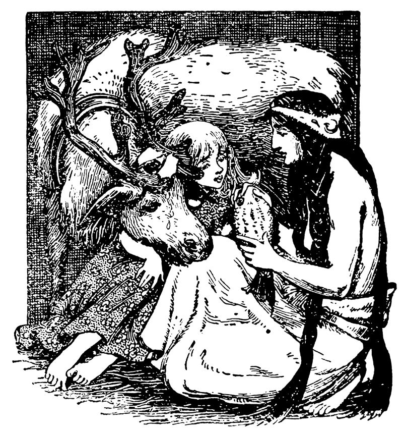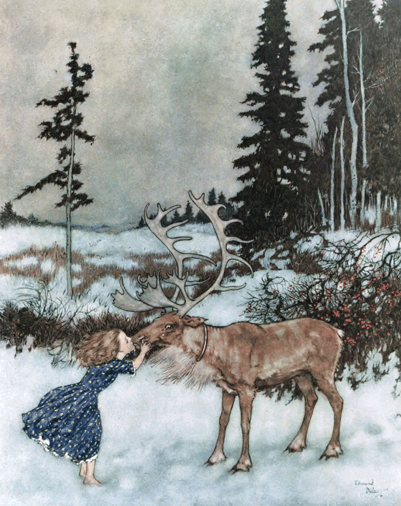“Oh, I have left my boots! I have left my mittens!” cried Gerda, as soon as she felt the biting cold. But the reindeer dare not stop: he ran on till he came to the bush with the red berries. There he put Gerda down, and kissed her on the mouth. Big bright tears ran down the creature’s cheeks; and then it ran back, as fast as it could. There stood poor Gerda without shoes, without gloves, in the midst of the terrible icy Finmark.