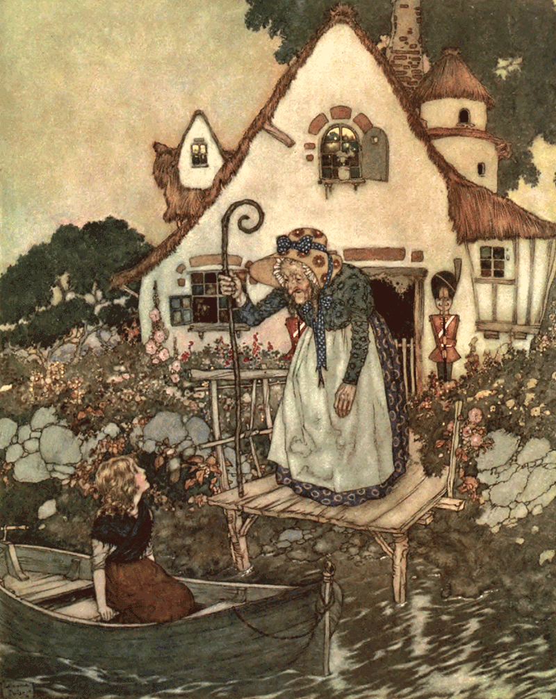 And then the old woman went right into the water, hooked the boat with her crutch, drew it to land, and lifted little Gerda out. Gerda was glad to be on dry land again, though she felt a little afraid of the strange old woman.